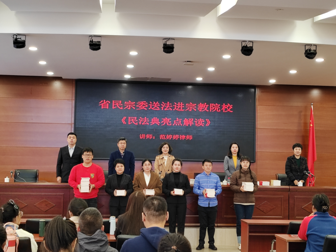 活动中,省民宗委政策法规处向黑龙江神学院的师生赠送了《习近平法治思想学习纲要》《中华人民共和国民法典》《中华人民共和国行政处罚法》等相关法律书籍200余本。