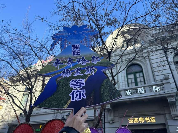 璀璨的民族服饰,悠扬的“乌钦”说唱,曼妙的“哈库麦勒”歌舞,一行人一亮相就吸引了无数游客的目光,引来游客拍照合影送祝福,互动中还为“小金豆”们送上了梅里斯达斡尔族区地产的豆干、小米锅巴等休闲食品,无不将梅里斯人的爽朗、热情展现得淋漓尽致。
