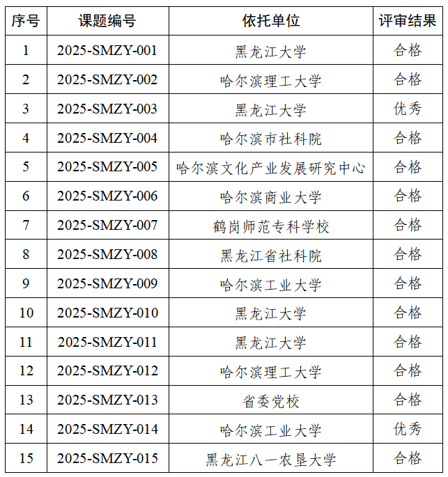 按照《黑龙江省民族宗教事务委员会关于申报铸牢中华民族共同体意识2025年支持课题的通知》要求,经申报、立项、结题、评审等程序,现将省民宗委铸牢中华民族共同体意识2025年支持课题评审结果予以公示(详见附件)。其中,优秀等级课题2项,合格等级课题13项。