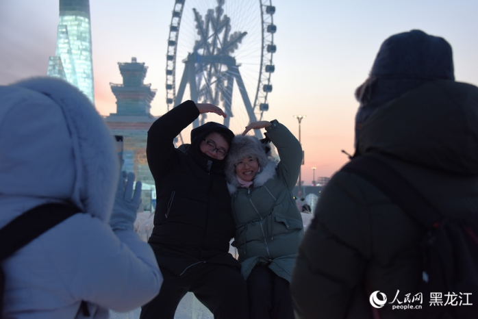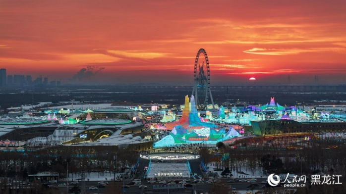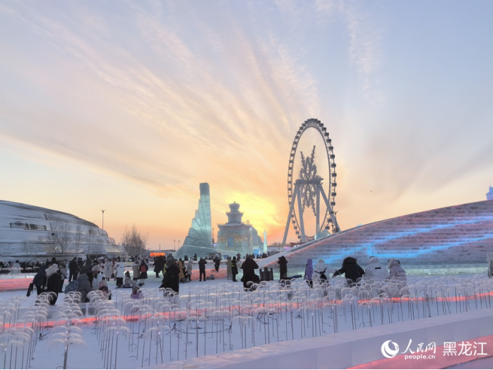 夕阳下的哈尔滨冰雪大世界。人民网 尚城摄